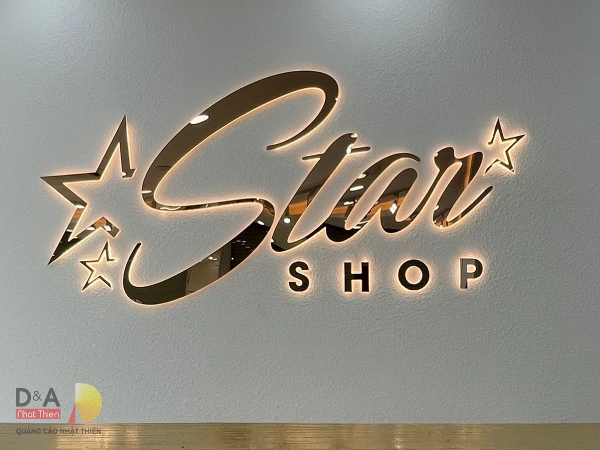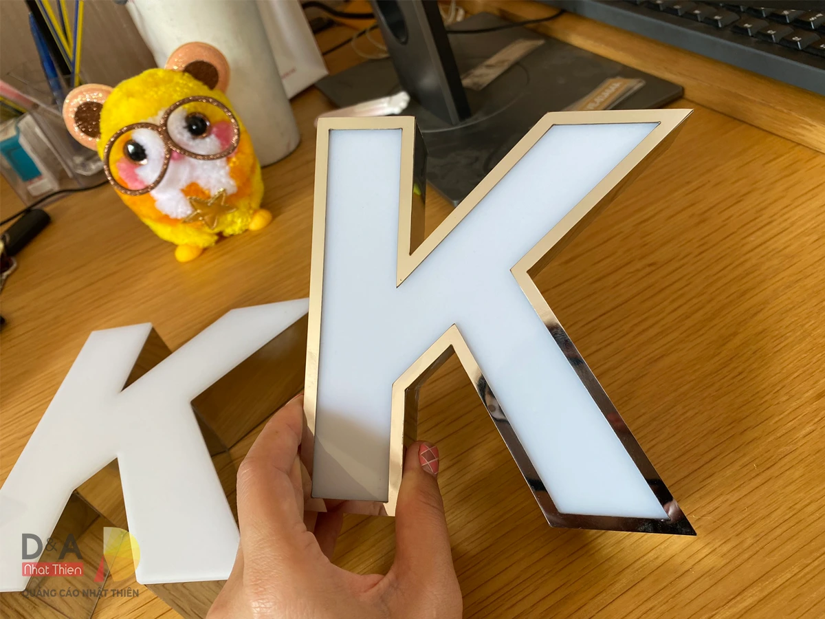 Mô tả sản phẩm: inox được gia công làm nổi đường nét tinh sảo, sơn màu, có thể dùng đế mica để dẫn sáng hoặc kết hợp đèn led trực tiếp để tạo ánh sáng hắt chân chữ.